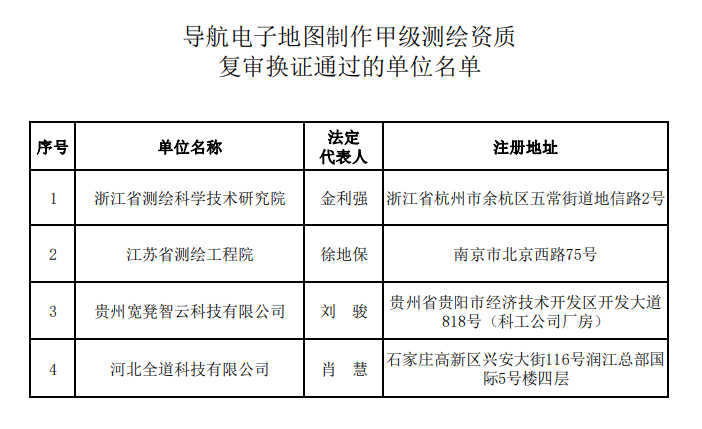 根據《中華人民共和國測繪法》《中華人民共和國行政許可法》以及測繪資質管理有關規定,現將審查通過的導航電子地圖制作甲級測繪資質復審換證單位名單予以公布。